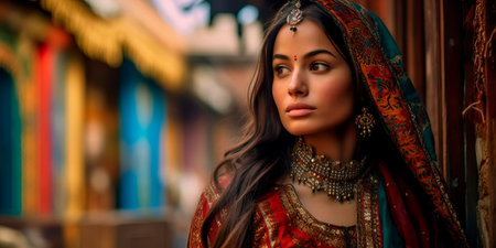 A beautiful Indian girl in a traditional Indian national costume, sari. Against the background of elephants. The portrait symbolizes the traditions, culture and beauty of the people of India.