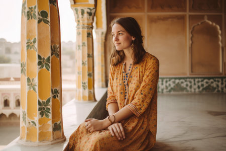 Potrait of woman posing at Amber Fort with green grass near Jaipur in Rajasthan, India