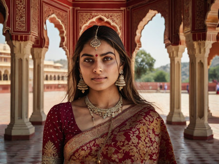 Portrait of a beautiful Indian woman in red saree at the Amber Fort in Jaipur, India.