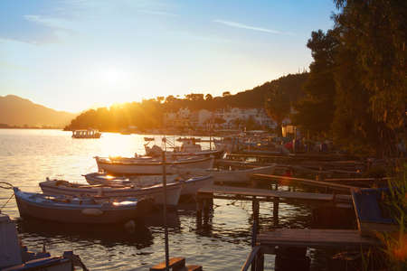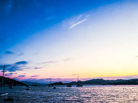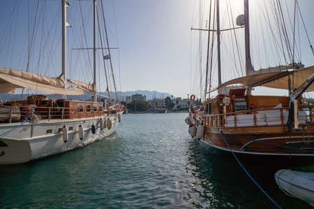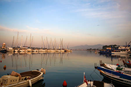 Panoramic beautiful view berth of marina. In the Turkish city of Icmeler. View of the island in the bay