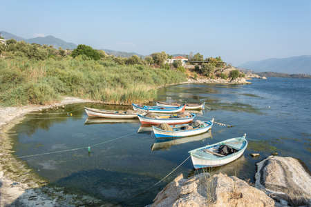 Fishing boats moored along the shore of Lake Bafa in Turkey.
