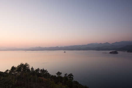 Twilight over the calm lake water and island with mountains. Famous Skadar lake in Montenegro. Nature background texture