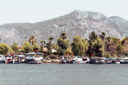 (Muğla - Turkey 05 February 2021) Travel boats in Akyaka, Kadın Azmağı Stream, one of the favorite places of tourism.