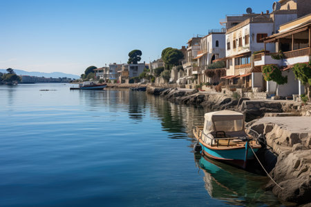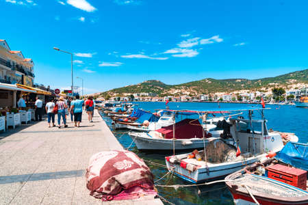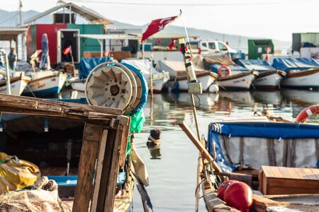 IZMIR, TURKEY - JUNE 05, 2019 : Fishing boats in touristic place of Aegean Region in Phocaea Town with old and historical, traditional architecture buildings. Phocaea is ancient city in old dates.