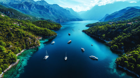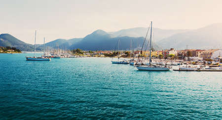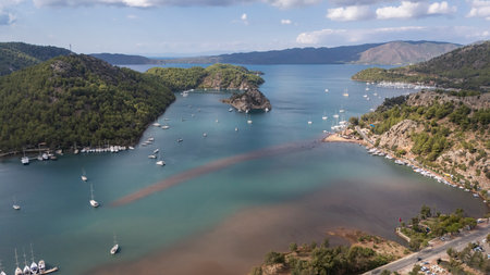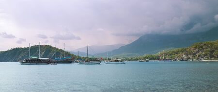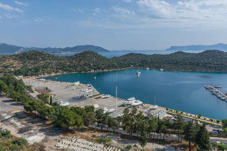 Magnificent view of the Mediterranean bay with floating yachts and boats, Demre district, Antalya province, Turkey.