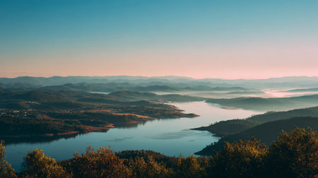 Breathtaking Aerial View of Serene Lake Surrounded by Rolling Green Hills