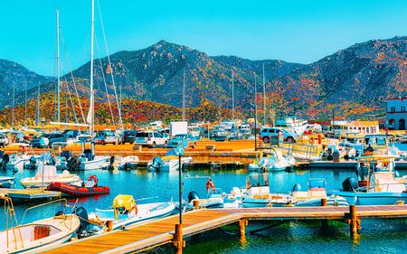 Boats and Villasimius Marina at Mediterranean Sardinia Island Italy reflex