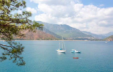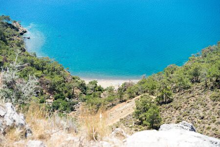 Beautiful scenery of bay and mountains and blue sky. Mediterranean sea coast. Nature of Turkey.