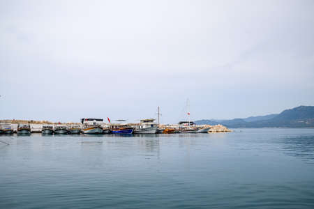 Demre, Turkey - May 22, 2019: Yachts on the sea coast. Pleasure boats at the pier.