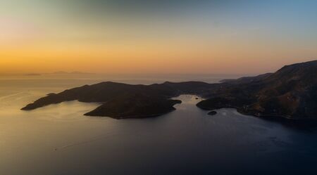 Picturesque Greece landscape with yacht during sunset. Wonderful colorful seascape. Sailing ship yachts with white sails at opened sea.