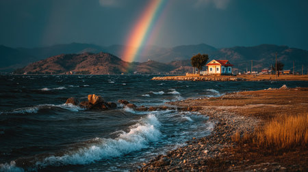 Mountain, sea, sky landscape. Picturesque nature view background in Turkey