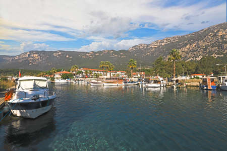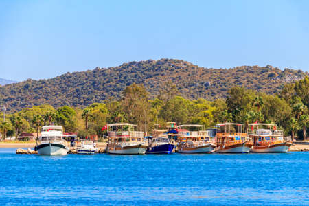 Port with tourist boats on the Mediterranean sea coast in Turkey