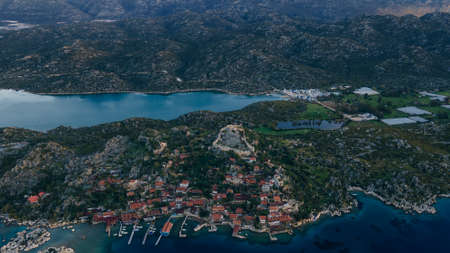 The village of Kalekoy, Kekova view from drone. the Byzantine Simena castle in the center near Kekova island in the Antalya Province of Turkey. high quality photo