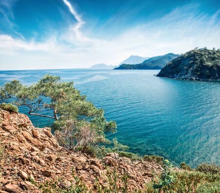 Splendid Mediterranean seascape in Turkey. Sunny view of a small azure bay near the Tekirova village vith Mt. Tahtali on background. Beauty of nature concept background.