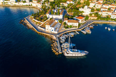 Aerial view of an anchored luxury yacht and fisher boats in the old harbour of the Argosaronic island Spetses, Greece, in front of church Agios Nikolaos