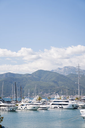 Marina with expensive yachts in the bay against the backdrop of green mountains