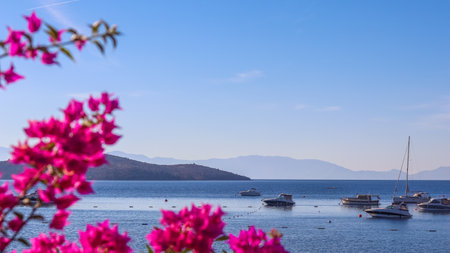 Summer vacation and coastal nature concept. Purple bougainvillea flowers on the background of the sea, islands and boats. Bitez Bodrum Turkey.
