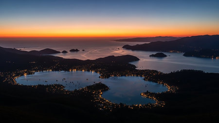 Calm showing panoramic aerial view of a coastal town nestled in a bay at twilight with illuminated lights reflecting on the calm water and vibrant sunset sky...