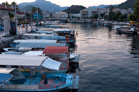 Marmaris, Turkey - May 07, 2014: Trip boats moored on the embankment in twilight. Boat trips are lovely recreational activity for thousands of tourists