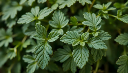 Macro shot of green motherwort leaves with serrated edges. Medicinal herb known for calming and heart-supporting properties, captured in outdoor sun lighting. Leonurus cardiaca