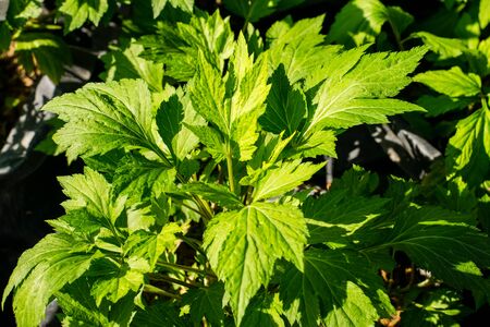 Garden plants. Lavish foliage in summer time. Background with green leaves.