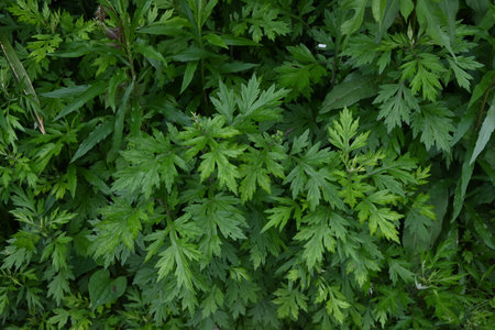 Ambrosia. Close-up of annual ragweed green leaves with selective focus on foreground