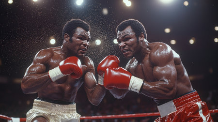 powerful punch thrown muscular male boxer intense match while his opponent skillfully dodges vibrant arena filled bright lights and electrified crowd.