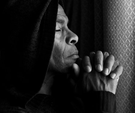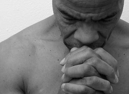 man praying to god with hands together Caribbean man praying with white background stock photo
