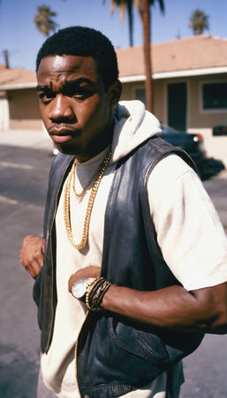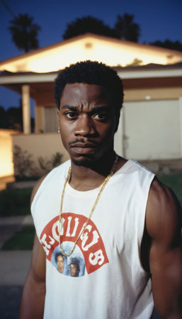 photo of angry black person man with tank top in neighborhood ,generative AI