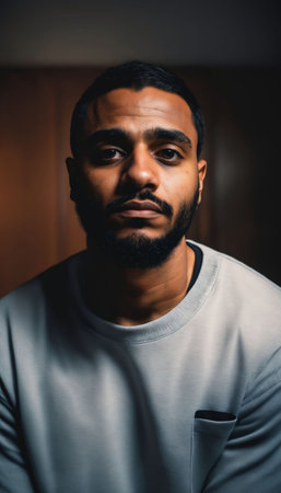 An attractive indian man gazes intently with confidence, illuminated by soft studio lighting.