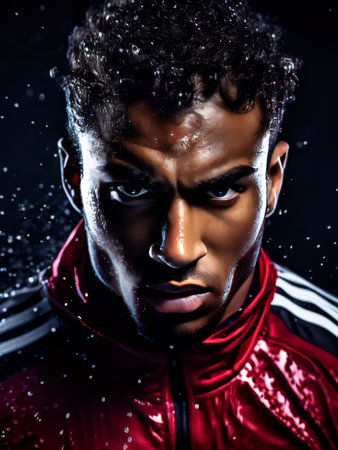 An AI generated illustration of A mature African-American man with a serious expression on his face, wearing a bright red sweater