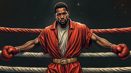 poster with a black boxer, dressed in a red robe and gloves, in a fighting stance with a determined look on his face. Portrait of african american boxer standing in boxing ring.