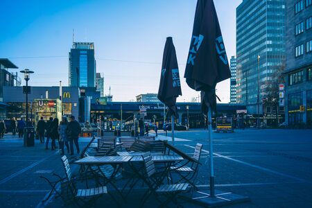 BERLIN, GERMANY - MAY 08, 2014: Turists visiting Alexander Platz, the central square in East Berlin, which was designed by German architect Peter Behrens