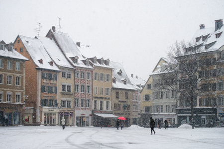 Mulhouse - France - 11 February 2021 - View of the medieval architecture on the main place by snowy day