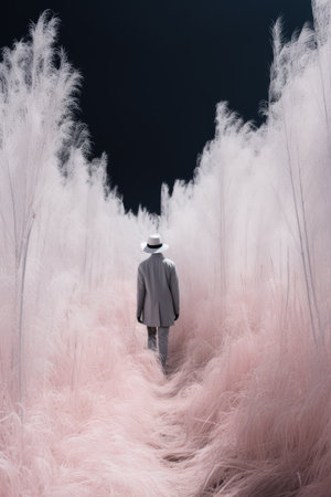 a man in a white suit walks through a field of pink pampas grass