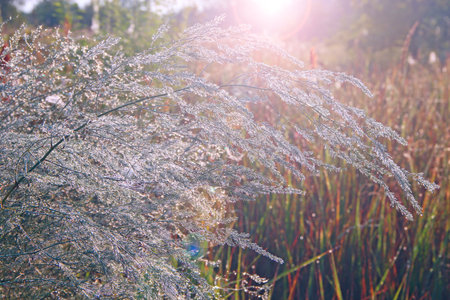 Branches of asparagus officinalis in morning dew illuminated by rays. Green leaves of asparagus officinalis with droplets of dew in dawn. Summer plant close up. Morning view. Dew drops on the branches