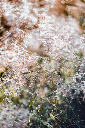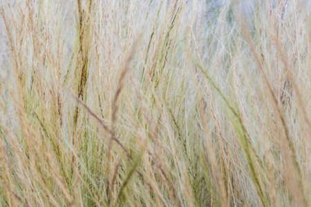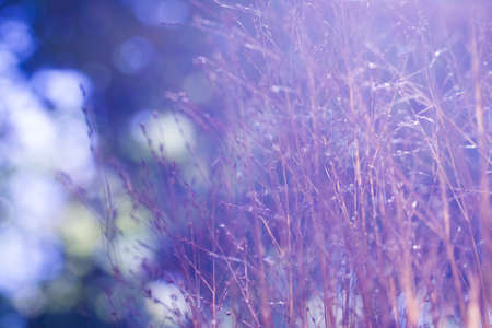 Natural fairy background. Beautiful grass of different colors bends down from the wind.