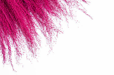 Dried flowers pink colored on white background with copy space. Top view