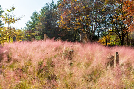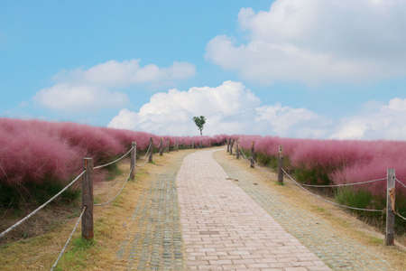 Beautiful Pink Muhly Grass Fields with a big tree in Gyeongju, Korea