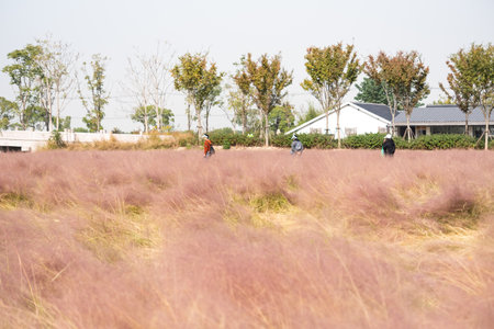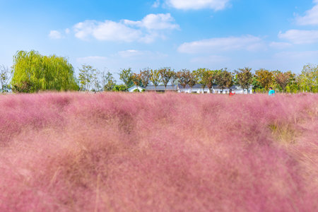 Pink muhly grass blooming in autumn season in seoul haneul park in mapo district, seoul, south korea
