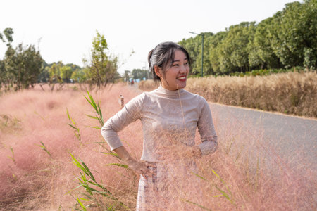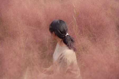 asian woman standing in the field of pink grass in the morning