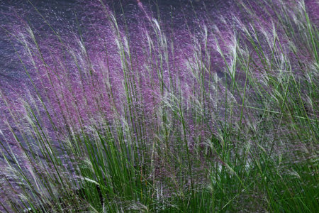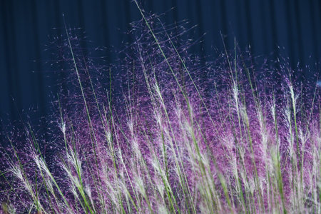 Muhlenbergia capillaris. Poaceae evergreen perennial. In early autumn, it produces numerous small reddish-purple flower spikes in panicles, creating a mysteriously beautiful space.
