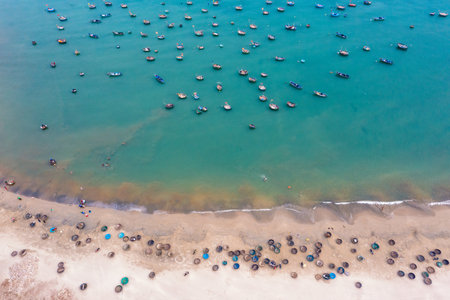Traditional Vietnamese boat in the basket shaped at Fishing village , Binh Thuan, Vietnam.