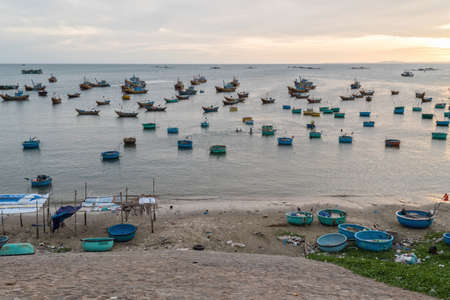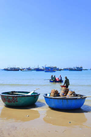 Mui ne fishemans village. Traditional Vietnamese boat in the basket shaped in Fishing village Mui Ne, Vietnam, Asia