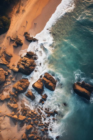 Aerial View of the Ocean From Above, Spectacular overhead view of a turquoise sea meeting rocky cliffs, AI Generated