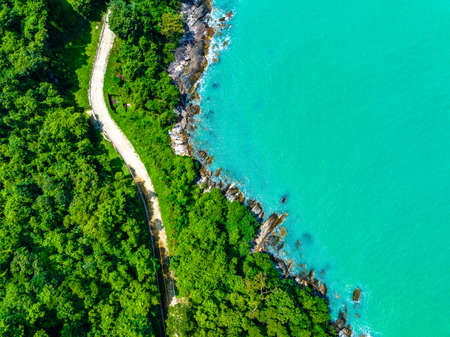 Amazing landscape nature view from Drone camera. Aerial view of seashore in phuket thailand. Beautiful sea in summer sunny day time season greeting background