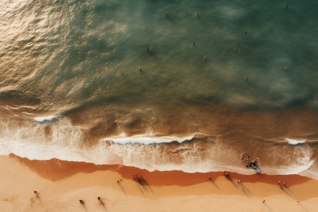 Experience a spectacular drone perspective of a gorgeous beach with crystal-clear sea waters and radiant sunlight, perfectly capturing the essence of tranquility and the beauty of coastal nature.
