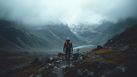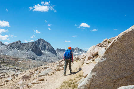 Backpacker in hike in the high mountains