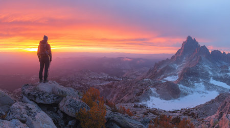 A lone figure stands on a rocky summit, silhouetted against a breathtaking sunset. Vibrant hues of orange and purple fill the sky, creating a magical atmosphere.