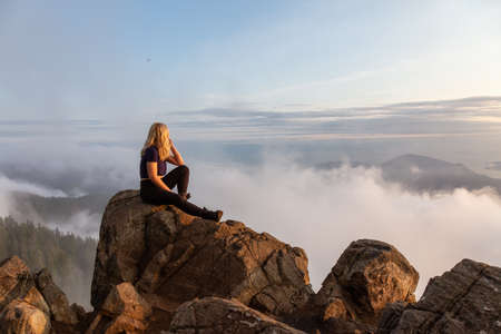 Adventurous Female Hiker on top of a mountain covered in clouds during a vibrant summer sunset. Taken on top of St Mark's Summit, West Vancouver, British Columbia, Canada.